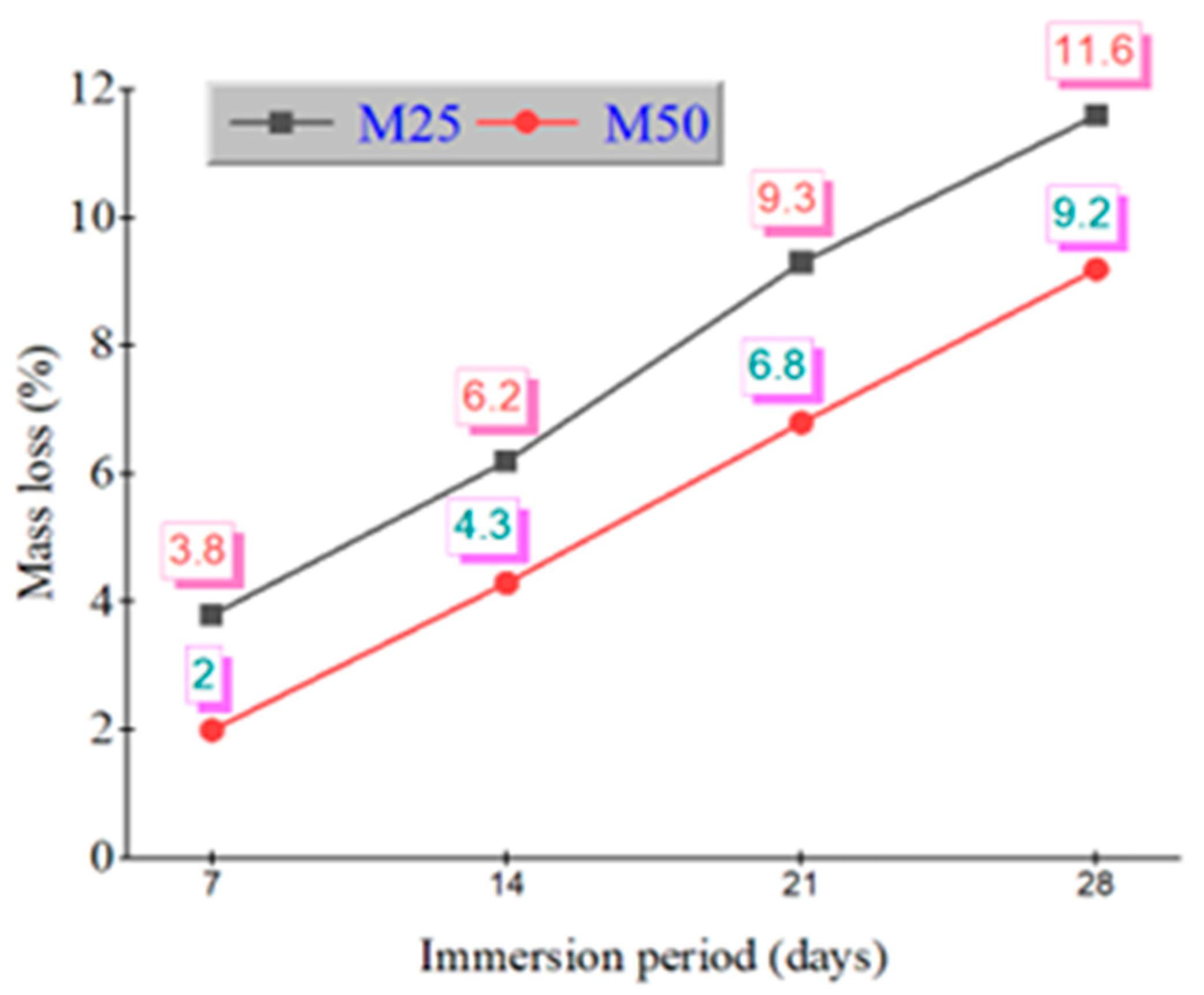 - Bakharev, T. Resistance of geopolymer materials to acid attack. Cem. Concr. Res. 2005, 35, 658–670. [Google Scholar] [CrossRef]