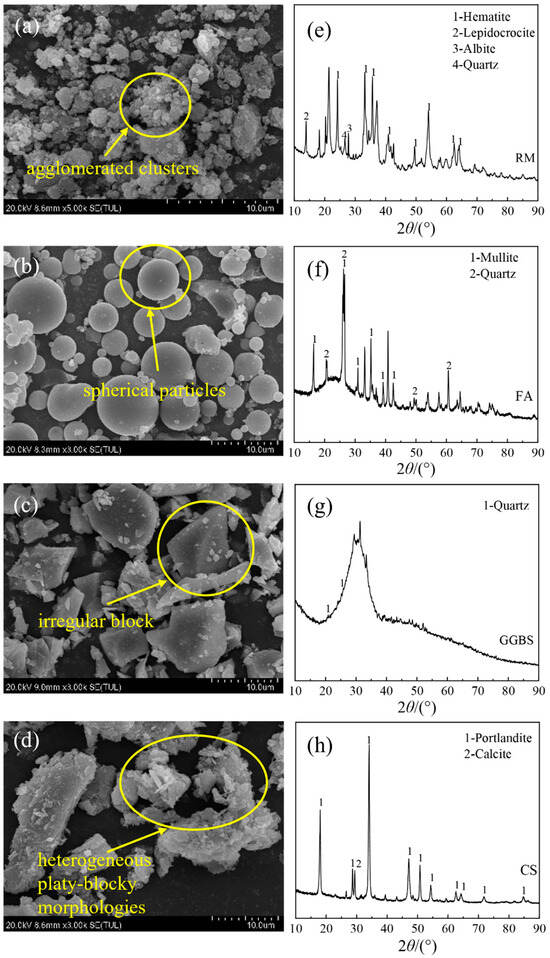 SEM micrographs and XRD spectra of raw materials. (a) RM agglomerated clusters, (b) FA spherical particles, (c) GGBS irregular blocky structure, and (d) CS platelet-blocky microstructure; (e) RM crystalline phases (hematite, lepidocrocite, albite, quartz), (f) FA primary phases (mullite, quartz), (g) GGBS amorphous structure with quartz, and (h) CS predominant calcite phase.