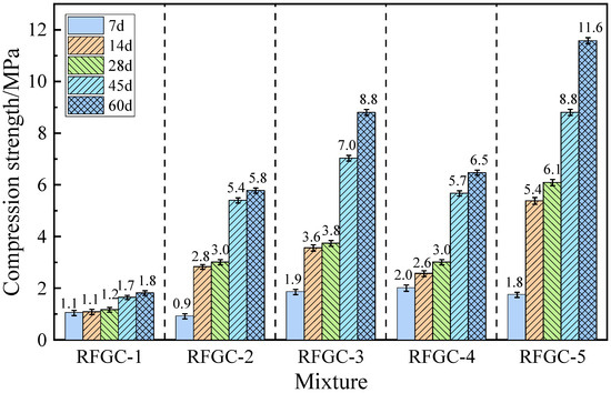 As shown in Figure 3, the compressive strength of all specimens increased with curing age. Specimen RFGC-1 (100% CS) exhibited the lowest strength (1.0–1.8 MPa), while RFGC-5 (100% GGBS) demonstrated optimal performance, achieving 11.6 MPa at 60 days. This confirms that GGBS outperforms CS in activating the geopolymerization of the red mud–fly ash system. For hybrid GGBS/CS specimens (RFGC-2, RFGC-3, and RFGC-4), the 60-day compressive strengths were 5.8 MPa, 8.8 MPa, and 6.5 MPa, respectively. Notably, the strength initially increased and then decreased as the GGBS content rose (with a corresponding reduction in CS content), indicating the critical influence of the GGBS/CS ratio on geopolymer strength. Overall, under a total solid activator content of ≤12%, the single-doped GGBS system exhibited superior strength compared to both single-doped CS and hybrid GGBS/CS systems.