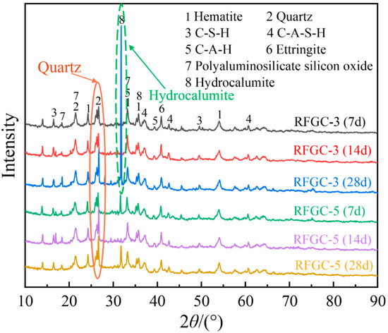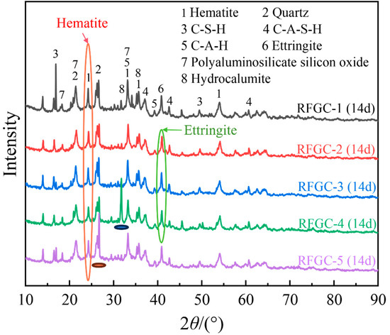 Figure 4 presents the XRD patterns of samples RFGC-1 to RFGC-5 at 14 days of curing age. The XRD profiles revealed that the mineral phases of the RFGC specimens were predominantly distributed between 20° and 40° (2θ). In addition to the original mineral phases of SiO2 and Fe2O3, the primary cementitious phases included calcium aluminate hydrate (C-A-H), calcium silicate hydrate (C-S-H), calcium aluminosilicate hydrate (C-A-S-H), ettringite (Ca6Al2(SO4)3(OH)12·26H2O, AFt), polyaluminosilicate silicon oxide (-Si-O-Al-Si-O-)n, and hydrocalumite (Ca4Al2(OH)12CO3·4H2O).