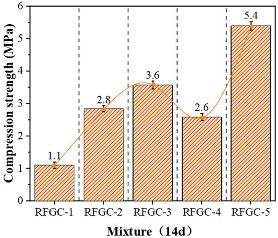 As shown in the SEM image of RFGC-4 (Figure 10d) and corroborated by the XRD pattern (Figure 4), the hydrocalumite content in RFGC-4 was higher than in RFGC-3 and RFGC-5. However, the compressive strength of RFGC-4 (14 d, 2.6 MPa) was lower than those of RFGC-3 (14 d, 2.6 MPa) and RFGC-5 (14 d, 5.4 MPa). This apparent contradiction arose because excessive hydrocalumite underwent agglomeration, where the electrostatic repulsion from surface charges became insufficient to overcome van der Waals attractions, resulting in loose aggregate structures within the geopolymer matrix. These porous agglomerates reduced both material densification and mechanical strength, despite the higher hydrocalumite content.