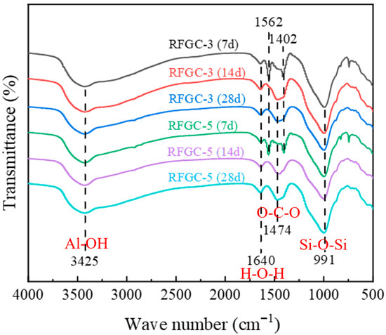 Analysis of the FTIR spectra for RFGC geopolymers (Figure 8) revealed four consistent characteristic absorption bands across all specimens. The band at 996 cm−1, attributed to the asymmetric stretching vibration of Si-O-Si bonds, serves as a fingerprint region for C-S-H gel formation [24]. Comparative quantification of absorption peak heights at 996 cm−1 demonstrated that RFGC-1 exhibited similar Si-O-Si band intensities to RFGC-3 and RFGC-4, yet significantly higher than RFGC-2 and RFGC-5. The lowest transmittance observed in RFGC-1 at this wavelength indicates stronger light absorption, corresponding to elevated C-S-H content. This aligns with the XRD results for RFGC-1 (14 d), where a prominent C-S-H diffraction peak emerged at 2θ = 15° (Figure 4). The absorption band at 1455 cm−1 corresponds to the asymmetric stretching vibration of O-C-O bonds in carbonate ions (CO32−) [34], arising from the carbonation of Ca(OH)2 in the presence of moisture and atmospheric CO2, forming CaCO3 [24]. The peak at 1640 cm−1 is attributed to the bending vibration of H-O-H bonds in water molecules [35]. Notably, the broad absorption band at 3427 cm−1 originates from the stretching vibrations of Al-OH groups within the [Al(OH)6]3− octahedral structure of ettringite (AFt) [36].