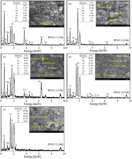 To directly observe the microstructural morphology of reaction products and analyze their chemical composition, SEM-EDS was performed on samples RFGC-1 to RFGC-5 cured for 14 days (Figure 10). For RFGC-1 (Figure 10a), the raw material surface exhibited dissolution and erosion, forming amorphous, clustered, and flocculent C-S-H gel with a loose structure. The 100% CS solid activator in RFGC-1 limited further reactions in the high-calcium/alkaline environment, preventing the transformation into C-A-S-H or (-Si-O-Al-Si-O-)n phases [33].