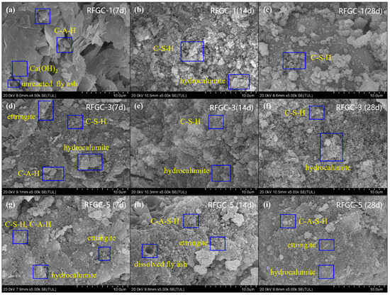 As shown in Figure 11g–i, combined with the XRD patterns of RFGC-5 cured for 7, 14, and 28 days (Figure 6), the reaction products from 7 to 28 days consistently included C-A-H, C-S-H, C-A-S-H, ettringite, polyaluminosilicate oxyhydrate, and hydrocalumite. The SEM images at 7 days revealed that most raw materials in the sample had undergone dissolution and hydration to form gels such as C-S-H and C-A-H, accompanied by hydrocalumite with a layered double hydroxide structure and elongated rod-like ettringite. With further curing, the morphology became denser compared to 7 days, and the reaction products significantly increased. Under high alkalinity, C-S-H and C-A-H gels further dissolved, leading to the cleavage of Si-O-Si and Al-O-Al bonds. The released Al3+ was adsorbed to form C-A-S-H, which underwent progressive polycondensation to generate (-Si-O-Al-Si-O-)n geopolymers. Needle-like ettringite crystals interconnected between particles, penetrating the gel matrix, thereby densifying the structure and reducing porosity. Additionally, the interfacial reaction products interwove into a network, enhancing the internal connectivity of the binder. Consequently, the 28-day compressive strength reached 6.1 MPa.