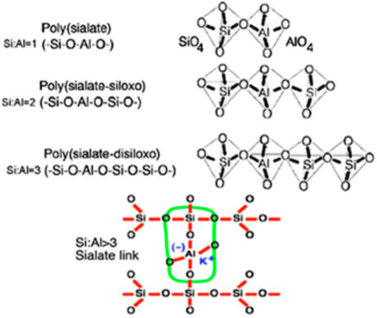 The geopolymerization reaction fundamentally involves the alkali-activated dissociation of Si-O and Al-O bonds in aluminosilicate precursors, forming silica-oxygen tetrahedra (SiO44−) and alumina-oxygen tetrahedra (AlO45−), which subsequently polymerize into a three-dimensional aluminosilicate network as illustrated in Figure 12.