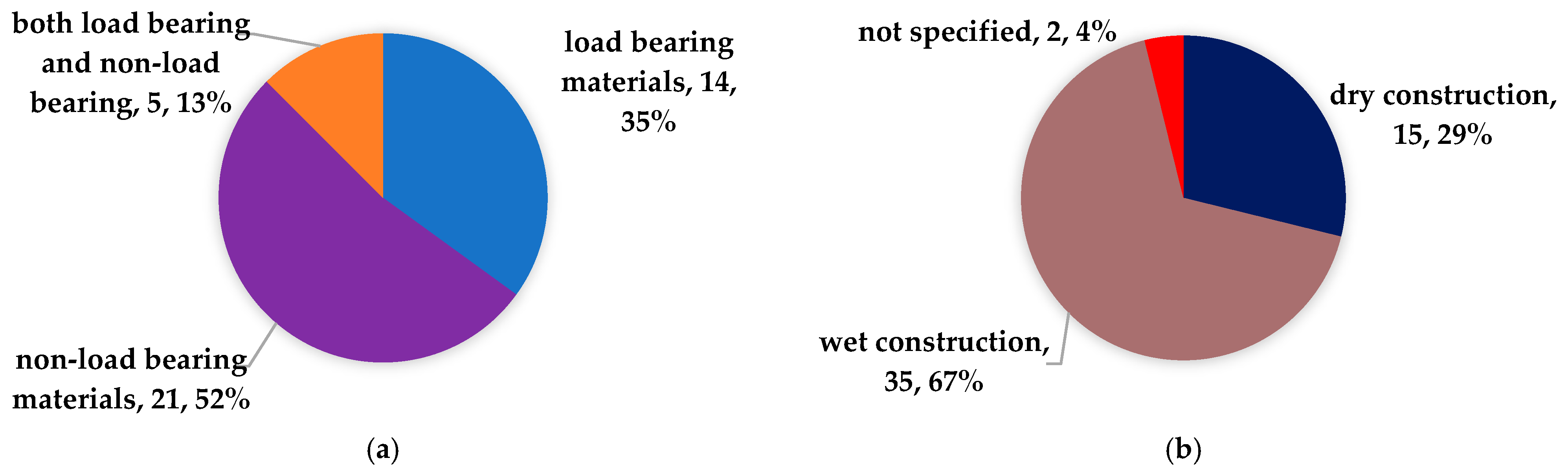 | Load bearing | wet | 3D Construction Technology | Concrete, earth-based mixes, cob, hempcrete | Cement Mortar | [55,63] |