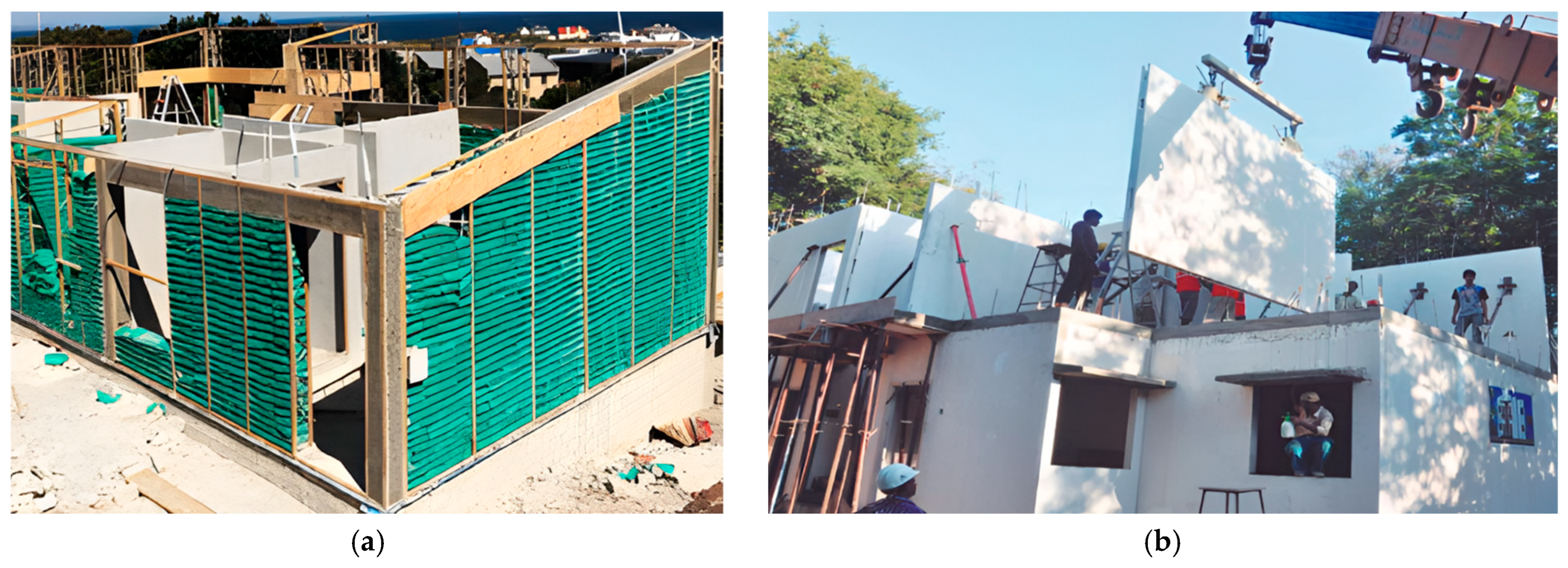 - Patil, D.; Bukhari, S.A.; Minde, P.R.; Kulkarni, M.S. Review on comparative study of diverse wall materials for affordable housing. Mater. Today Proc. 2023, 77, 823–831. [Google Scholar] [CrossRef]