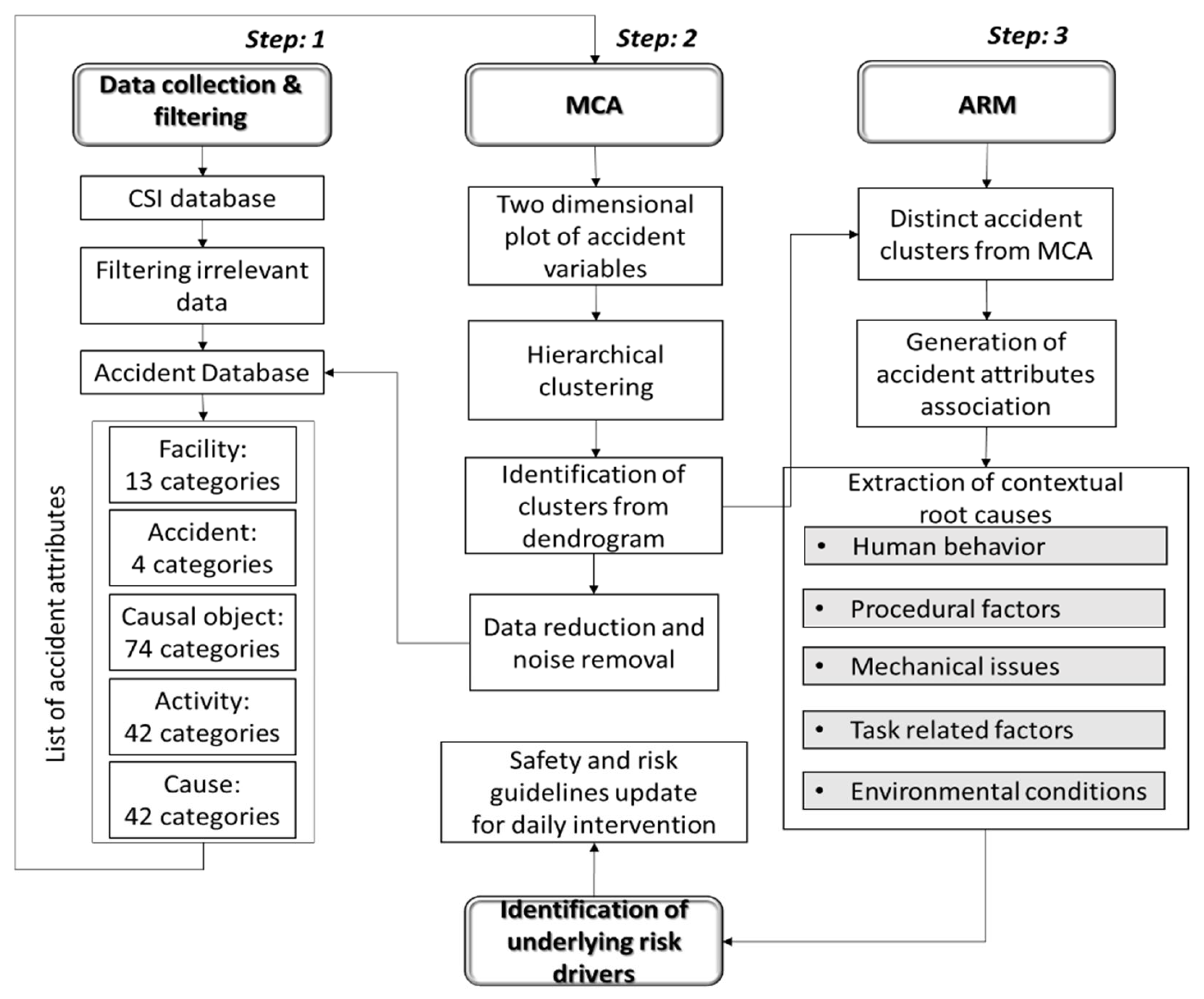 Therefore, the present study has two primary objectives. First, it addresses the lack of a framework for understanding on-site conditions that contribute to accidents, particularly the chain of mechanisms underlying construction accidents. To achieve this, the study uncovers critical associations among key accident components (such as accident type, project type, tasks performed, and objects involved) and links them to contributing causes (such as human error, procedural deficiencies, equipment malfunctions, task-specific hazards, and environmental conditions), by integrating two data mining techniques: MCA and ARM. This integrated approach enhances interpretability and analytical precision, while supporting the development of targeted intervention strategies aligned with daily construction activities. Second, the study addresses the present limitations of using MCA and ARM independently, by adopting an integrated analytical framework that applies MCA prior to ARM. In this sequential framework, MCA-based clustering is used first to reduce complexity and structure the dataset. With a more structured and focused dataset, ARM can then operate more efficiently and generate more meaningful, scenario-specific association rules.