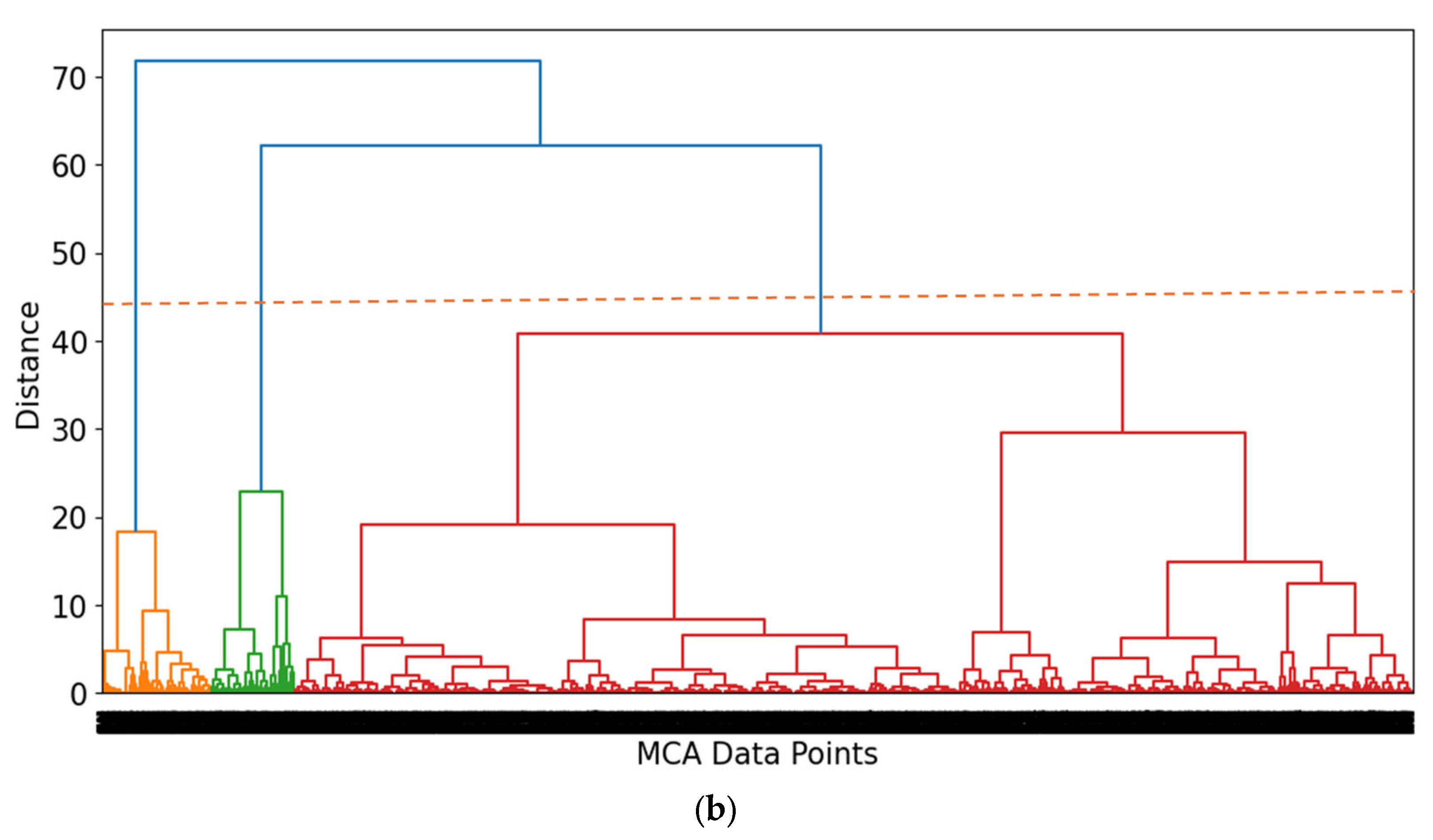 Figure 2b presents the dendrogram constructed from the MCA-derived data points. The top of the dendrogram represents the full dataset, with all data points eventually merged into a single cluster. In contrast, the densely populated lower section displays the original MCA data points before clustering. Horizontal cuts at different vertical distances yield varying levels of clustering granularity; in this study, a cut was made at approximately above 40 (dashed orange line), resulting in three distinct clusters containing 720, 549, and 7366 entries, respectively. This process effectively filters out noise within the data, reducing the dataset from 12,484 to 8635 for more focused analysis.