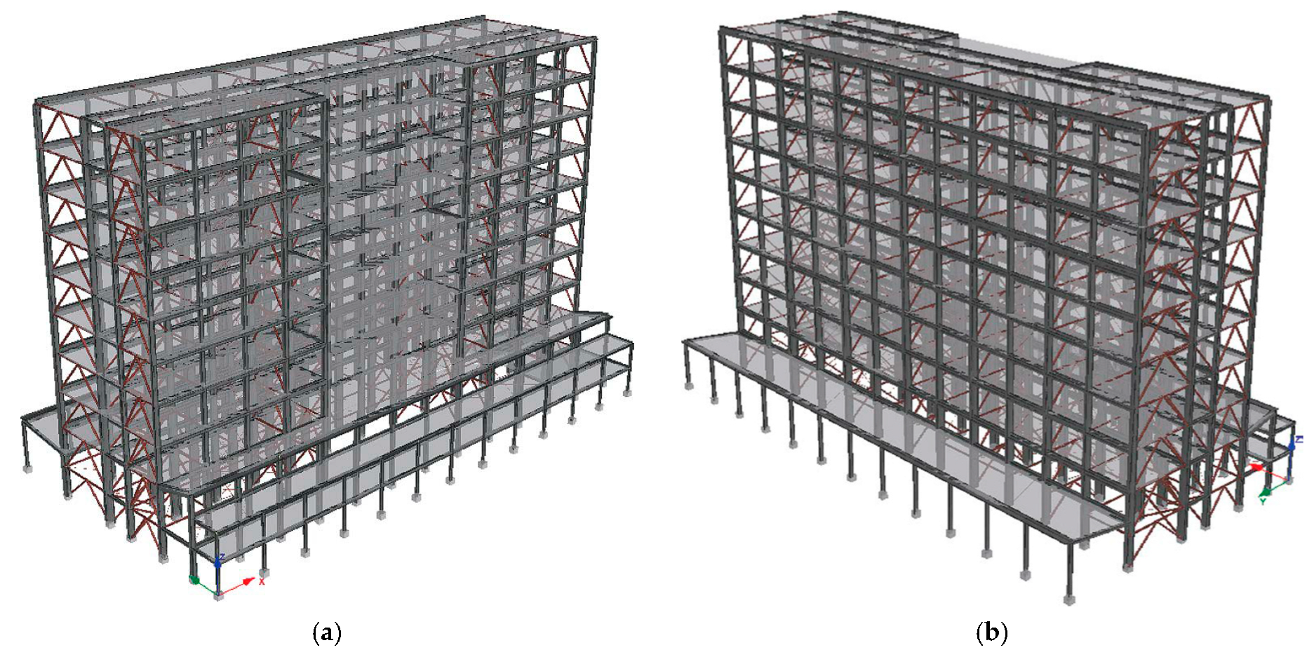- Integration of Bracing Systems: steel bracing systems were incorporated within the existing frame bays to enhance lateral resistance in both (Figure 2a) and (Figure 2b) orthogonal directions. Concentric braces were installed along the direction and inverted V-bracing was employed along the direction. In both cases, the bracing elements were connected to steel columns and beams, which were firmly anchored to the existing RC frame using specialized connectors to ensure proper load transfer.