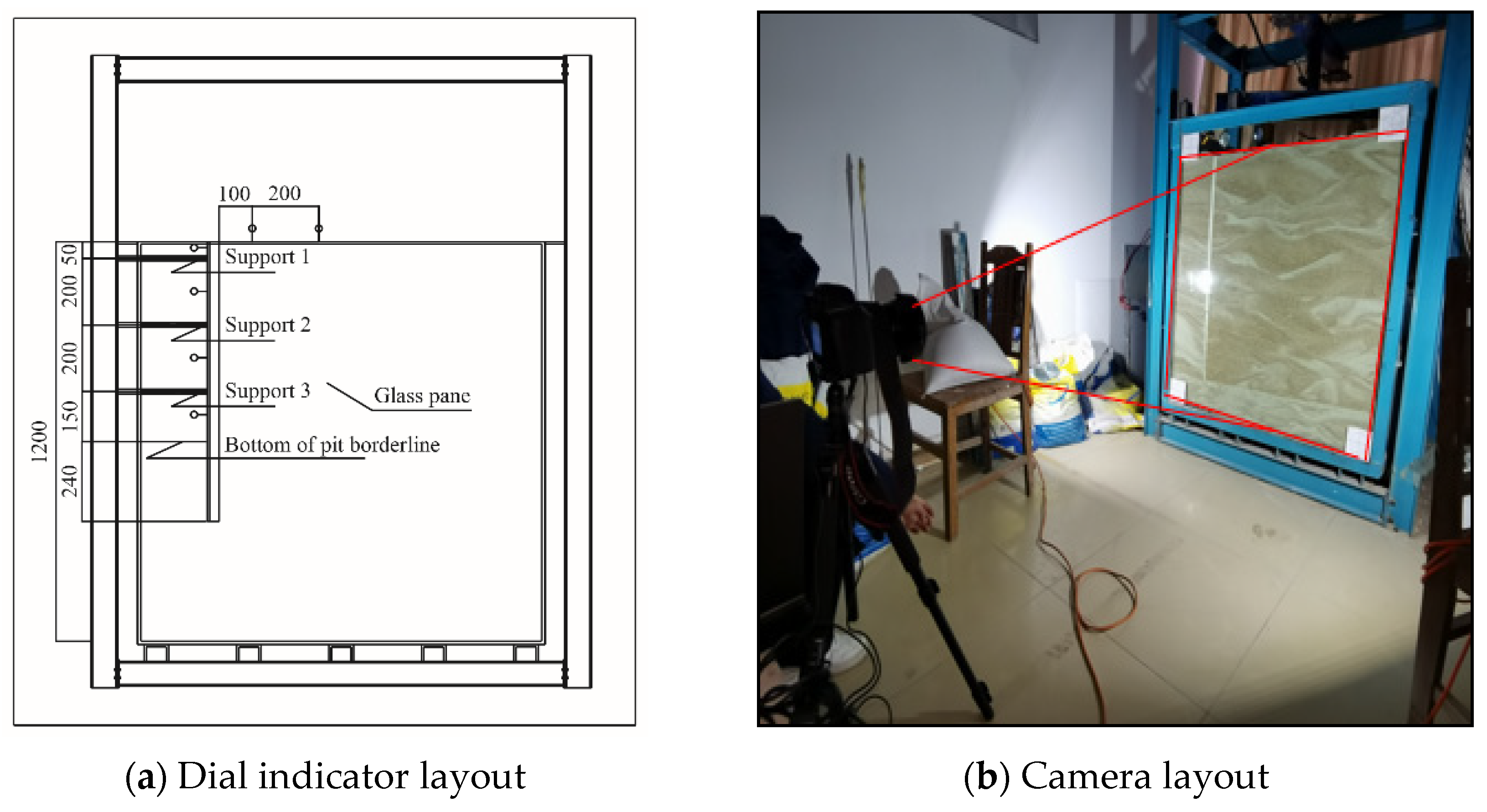The displacement was obtained through two different measurements. The first one was the measurement of soil deformation in the middle of the enclosure and around the pit with a dial indicator. The second was to set up a particle image velocimetry (PIV) camera to measure the soil displacement under different working conditions through reinforced glass and generate displacement cloud maps using the photo information. The dial indicator and camera arrangement are shown in