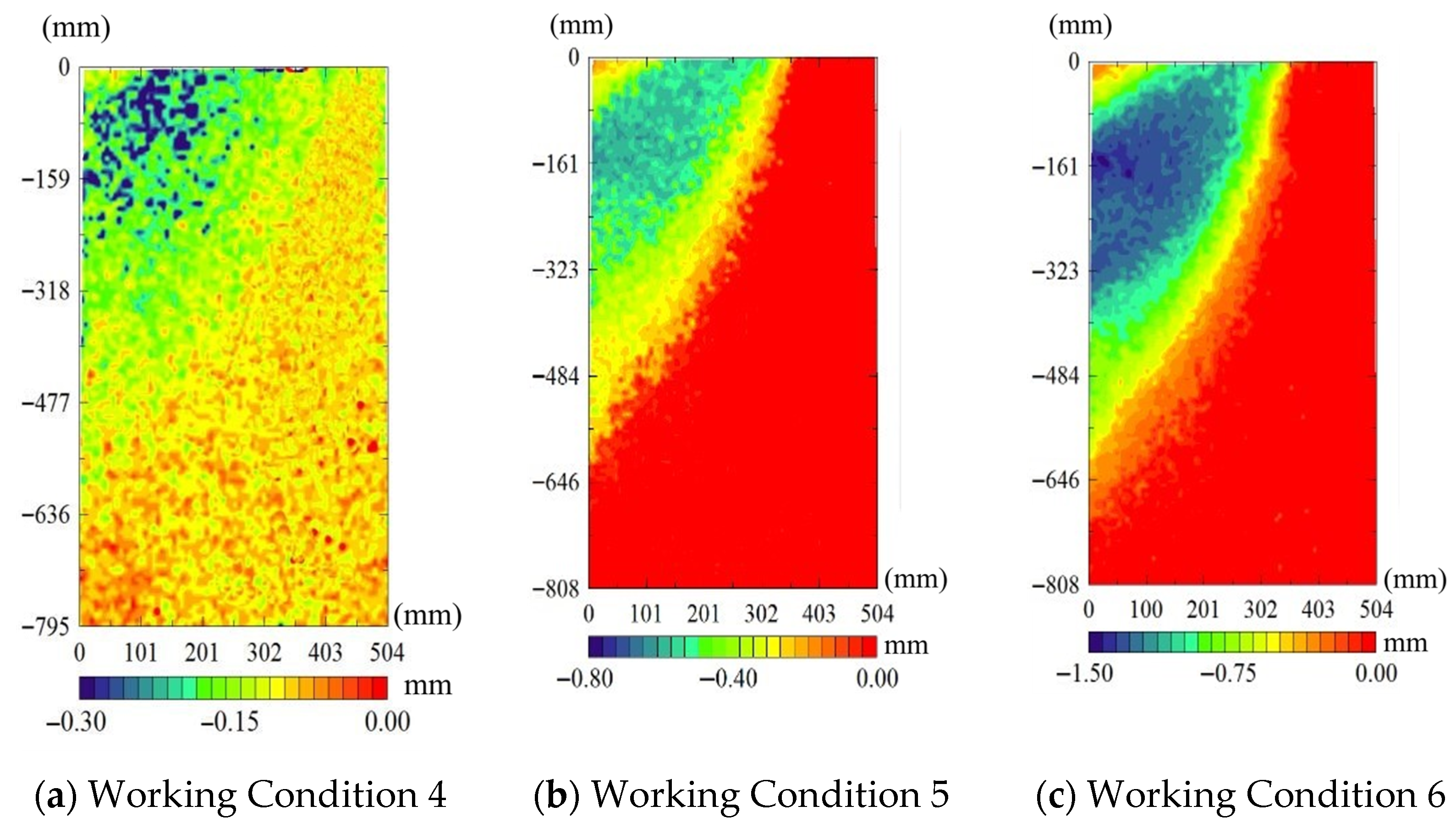 Figure 8 shows the horizontal deformation cloud map of the pit soil after the application of eccentric loading. When the load is applied at the ground surface, the soil on the loaded side undergoes active deformation under high shear stress. The soil in the high-stress concentration area experiences considerable compression and lateral extrusion, leading to rearrangement of soil particles and the formation of a distinct lateral displacement concentration zone at the location of the diaphragm wall on the loaded side.