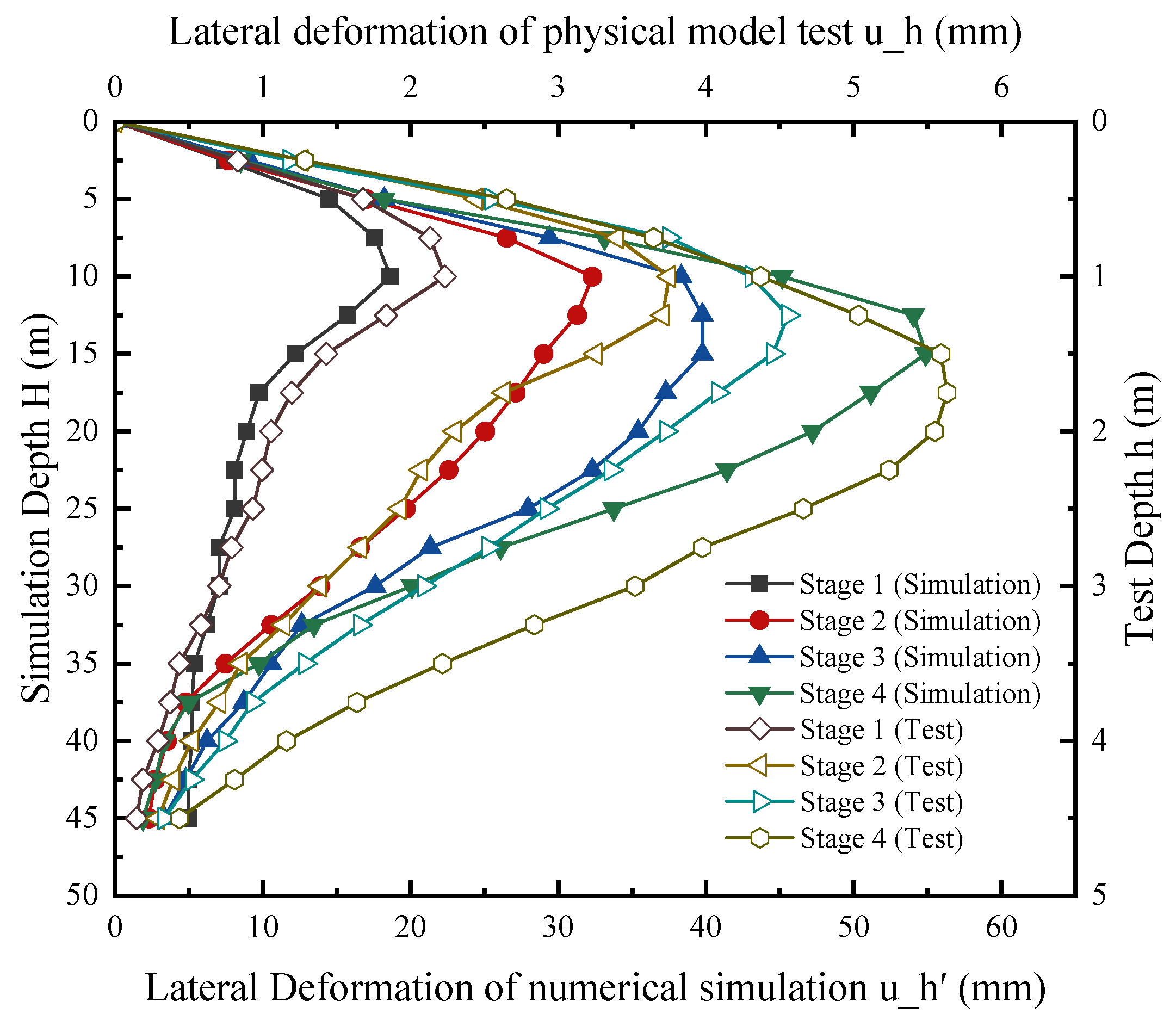 Figure 9 presents a comprehensive comparison of the horizontal displacement profiles of the excavation support structure obtained from both numerical simulations and indoor model tests under incrementally applied lateral bias loads. Overall, a good agreement is observed between the numerical simulation results and the indoor experimental measurements across all loading stages. At lower loading stages (Stage 1 and Stage 2), the numerical predictions closely match the experimental observations, with only minor deviations. This indicates that the numerical model effectively captures the linear or nearly linear elastic response of the soil-support system under smaller loading conditions. Although slight variations were present at elevated loading conditions, the numerical model effectively reproduced the global deformation behavior and the responsiveness of the support system to increased lateral loading. It was observed that the point of maximum deformation within the support structure migrated downwards with escalating loads, a finding entirely consistent with laboratory experimental outcomes. Consequently, the strong agreement between the numerically derived horizontal displacement profiles and the empirical results validates the established numerical model’s robustness and predictive capacity, thereby affirming its suitability for subsequent research on deformation control of foundation pits. Consequently, the strong agreement between the numerically derived horizontal displacement profiles and the empirical results validates the established numerical model’s robustness and predictive capacity, thereby affirming its suitability for subsequent research on deformation control of foundation pits.