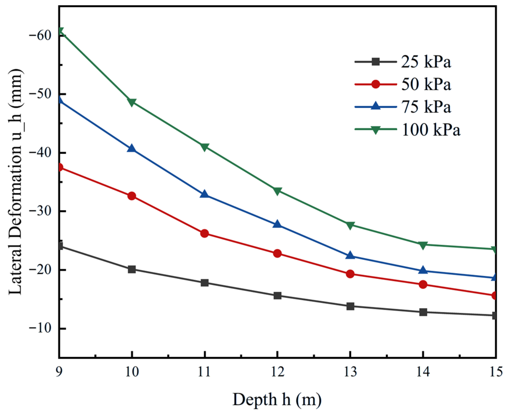 Figure 10 illustrates the variation in excavation horizontal displacement with retaining wall thickness under different levels of asymmetric loading. Overall, the curves indicate a pronounced negative correlation between wall thickness and displacement, with a nonlinear decreasing trend as thickness increases. Taking the maximum load of 100 kPa as an example, when the wall thickness is only 4 cm, the lateral displacement reaches approximately −80 mm, suggesting insufficient excavation stiffness and significant horizontal movement of the retaining structure under high loading. As the thickness increases to 10 cm, the displacement is reduced to about −40 mm, nearly a 50% decrease. Beyond 12 cm, however, the rate of reduction diminishes, implying diminishing marginal benefits of further thickening.