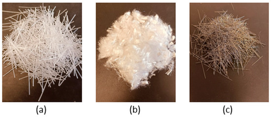Fiber types used in the present study: (a) polypropylene fiber braid, (b) polypropylene commercial fibers, and (c) steel fibers.