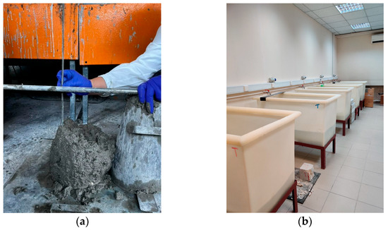 The concrete mix design was determined in accordance with ACI 211.2 [16] under a volumetric method to achieve a target characteristic compressive strength (fck) of 28 days as 30 MPa, which is the same as the standard target strength. The aggregates used in the study correspond to typical limestone, well-graded sand (maximum grain size 4.75 mm), fine and coarse gravel (maximum grain size of 12.5 and 25.0 mm, respectively) and the design slump was 75 to 90 mm (Class S2 according to EN 12350-2:2009 [17]) (Figure 2). Specimen casting was performed under laboratory conditions with CEM II/A-P to produce strength class C30/37 concrete. The water-to-cement ratio (W/C) was fixed at 0.54 for all batches in the conducted experiments. The sole variable of the mixtures was the inclusion of steel and polypropylene fibers with different fiber lengths and diameters. Curing was provided for 28 days under normal ambient conditions using potable water in designated plastic curing tanks in order for the specimens to reach their full strength (Figure 2). The reference sample (plain specimen) and their fiber-reinforced counterparts (PFRC/SFRC specimen, PFBRC/SFRC specimen, PFRC/PFBRC specimen, PFRC/PFBRC/SFRC specimen) were provided with the same curing treatment. A follow-up experimental program with hybrid fiber reinforcement was performed to ascertain the synergistic advantages of incorporating steel and polypropylene fibers, together, to further enhance the mechanical performance and characteristics beyond the achievable levels for each type of fibers [14]. Table 2 presents the detailed proportions of each constituent, including the admixture Visco 6000, which functions as a high-range water-reducing plasticizer to improve workability. It is noted that, in standard mix design, aggregate content should typically be reduced with increasing fiber content to maintain consistent workability and volume balance; however, in this study, the aggregate mass was kept constant to allow for direct comparison across mixtures.