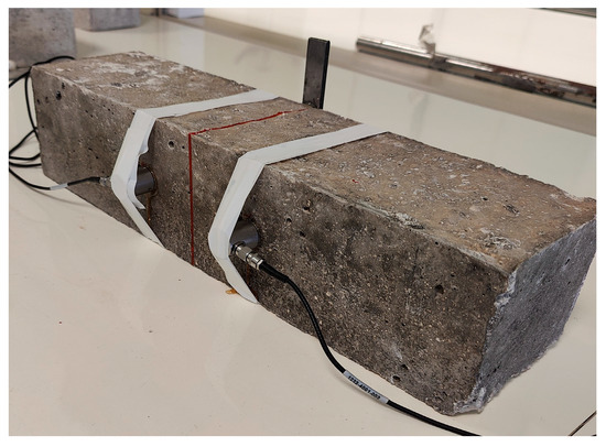 In order to observe the evolution of bending tests more effectively, the non-destructive testing method of acoustic emission (AE) was used with the help of two sensors (Figure 3). With this method, internal deformation within the specimen can be monitored in real-time and valuable information about its mechanical behavior, such as microcrack formation, crack propagation, flexural cracking and damage location, can be obtained [18,19]. AE was applied to five different samples: a plain (unreinforced) sample, a sample reinforced with polypropylene fibers and steel fibers (PFRC/SFRC), a sample with polypropylene fibers and a polypropylene fiber braid (PFRC/PFBRC), a sample with steel fibers and a polypropylene fiber yield (SFRC/PFBRC) and a hybrid sample with all three forms of reinforcement (PFRC/PFBRC/SFRC) [15,20].