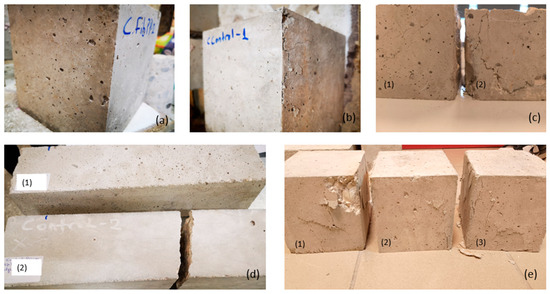 (a) Polypropylene fiber-reinforced cubic specimen under compression and (b) unreinforced cubic concrete specimen after compression. (c) Comparative results of the two cubic test samples after compression: (1) fiber-reinforced concrete and (2) unreinforced concrete. (d) prismatic specimens after the four-point bending test (1) fiber-reinforced prismatic specimen showing only cracks and (2) unreinforced specimen which was completely detached. (e) Comparative results of concrete samples after compression: (1) unreinforced concrete, (2) polypropylene fiber-reinforced concrete and (3) steel fiber-reinforced concrete.