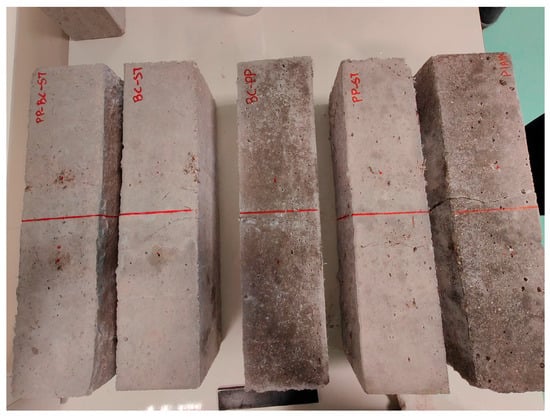 For specimens containing polypropylene fibers, visual observations revealed that upon crack formation, no fragments were produced in the cubic specimens subjected to fracture and no part of the prismatic specimens subjected to four-point bending became detached (Figure 4 and Figure 5). This indicates a significant enhancement in the structural integrity of the material due to the addition of polypropylene fibers. The fibers appear to act as bridges across cracks, distributing stress and preventing complete disintegration under load [25,26]. These improvements suggest potential applications in areas requiring durable and resilient materials, such as earthquake-resistant structures or military installations [27]. Further studies could explore optimal fiber concentrations for various use cases, potentially leading to broader implementation across different engineering fields.