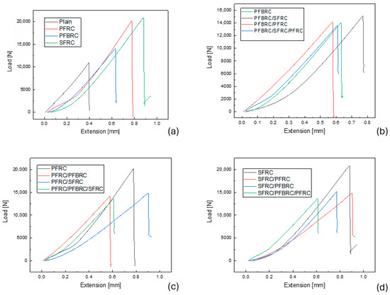 Four-point bending diagram and comparison of fiber-reinforced specimens (a). Four-point bending diagram and comparison of samples reinforced with different types of fibers based on polypropylene fiber braid (b). Four-point bending diagram and comparison of samples reinforced with different types of fibers based on commercial polypropylene fibers (c). Four-point bending diagram and comparison of samples reinforced with different types of fibers based on linear steel fibers (d).