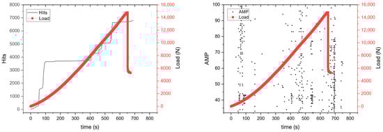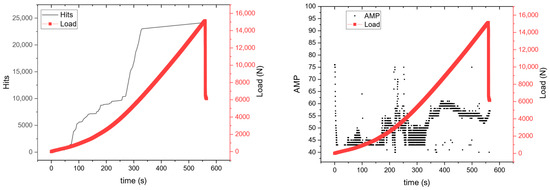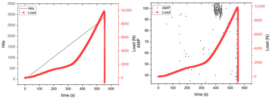 Acoustic emission diagrams with accumulative AE hits and amplitude for plain specimen.