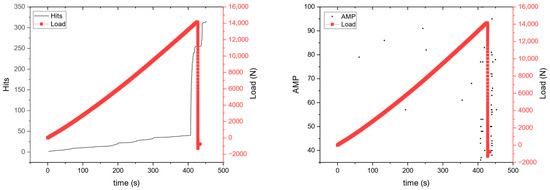 For the PFRC/PFBRC specimen (Figure 10), there is a sudden increase in hits close to the breaking point of the specimen. According, also, to the amplitude diagram, there were events at relatively high dBs (80–90) at the start of the experiment, indicating the breaking of the polypropylene fiber braids without the breakage of the specimen, in accordance with previous research [Tan et al., 2021] [36].
