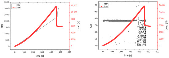 Regarding the plain specimen (Figure 7), there is a steady increase in acoustic emission hits until the specimen reaches its breaking point at approx. 9 kN. According to the amplitude diagram, the initial hits are caused by internal micro-cracks at relatively low dB (40–70 dB) and as the load progresses, there is an increase in dB, as the accumulation of cracks suddenly forms a macroscopic crack, breaking the specimen according to research by [Aggelis 2011] [30].