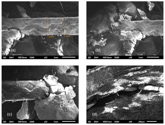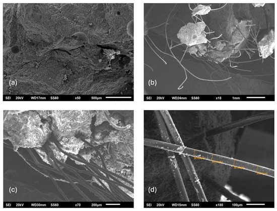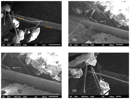 SEM images of concrete reinforced with a combination of polypropylene fibers. (a–c) Concrete samples containing both commercial polypropylene fibers and polypropylene fiber braid, illustrating their combined dispersion and bonding within the matrix. (d) Fractured surface of the concrete specimen showing partial disintegration and pull-out of the polypropylene fiber braid after mechanical failure.