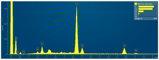 High-resolution electron microscopy (Figure 12, Figure 13 and Figure 14) provides clear evidence of multi-scale retention of particulate fragments resulting from the integration of polypropylene fibers with varying lengths and diameters (see Figure 12b–d and Figure 14a,d). Figure 12, Figure 13 and Figure 14 illustrate how polypropylene fibers entangle and anchor small matrix fragments across multiple length scales, promoting a more cohesive microstructure. This retention capability is attributed to the inherent flexibility and surface characteristics of polypropylene fibers, which enhance the mechanical interlock between the fiber and the surrounding cementitious phase. The presence of these fibers significantly improves the structural integrity of the composite by distributing internal stresses more uniformly across the matrix, reducing the risk of localized failure points and crack propagation, as observed in previous research [Santos et al., 2005; Liu, Jia and Wang 2019] [42,43]. As a result, the composite exhibits improved durability and resistance to dynamic and long-term mechanical loads. Stoichiometric analysis is also observed through scanning electron microscopy (see Figure 15) in order to verify the existence of elements of the concrete as well as the polymeric fibers. Furthermore, tailoring the lengths and diameters of the fibers offers a strategic approach to optimizing performance for specific engineering applications, including infrastructure exposed to cyclic loading or harsh environmental conditions.