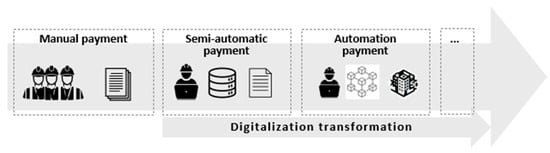 The construction industry, characterized by a complex network of stakeholders, is fraught with challenges in its payment processes, mainly due to the intricate web of contractual relationships and financial transactions. In this industry, architects, engineers, contractors, subcontractors, suppliers, and project owners interact in a multifaceted ecosystem, each with distinct roles and responsibilities, leading to a convoluted system of contractual commitments []. The evolution of construction payment systems, as illustrated in Figure 1, demonstrates a progressive trajectory from manual to semi-automatic approaches, with the industry currently transitioning toward fully automated solutions to address persistent inefficiencies in financial transaction processing.