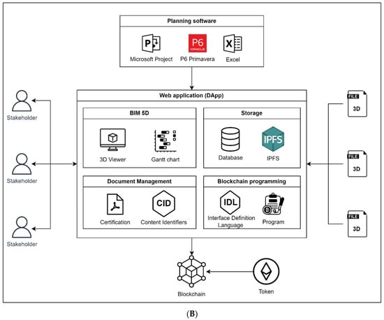 The Dapp BIM-5D (DB5D) framework is a web-based decentralized application (DApp) designed to facilitate construction management tasks such as planning and payment. The proposed framework consists of several modules, as depicted in Figure 2. The framework is compatible with BIM file formats such as Revit, IFC, DWF, and others. The DB5D framework incorporates a 3D viewer for visual representation and a Gantt chart displaying the construction schedule derived from planning software. The framework employs a database to store user data and construction schedule data, and decentralized cloud storage for documentation. The storage module is capable of integrating with the document management module to store different construction documents, including shop drawings, construction records, and certifications. The blockchain network, program, and program-derived address (PDA) enable the secure storage of payment data and the generation of funding, thereby facilitating the integration of the framework with a fungible token. The components of the proposed framework are outlined in the subsequent sections.