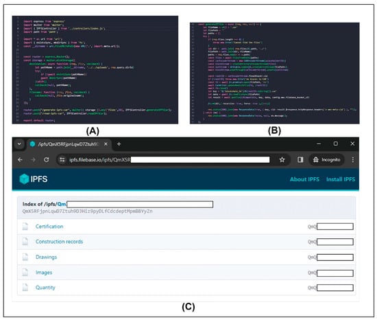 Consequently, the prototype utilizes a distinct format for IPFS, known as Content Addressable Archives (CAR) []. This format stores data as blocks, which are sequences of bytes. Each block is prefixed with a CID that is derived from the hash of the data. This format is compatible with IPFS. A compression module was developed using Node.js and Docker to facilitate the storage of documentation in a prototype (in Figure 5A,B). For instance, once tasks are completed on an actual construction site, the contractor can utilize DB5D to initiate a payment through blockchain technology. The contractor will upload all documents, specifically those that serve as documentation for payment. The compression module will then compress all the documents into a single car file. Using this car file, stakeholders can effortlessly retrieve and view it on the IPFS explorer (in Figure 5C).