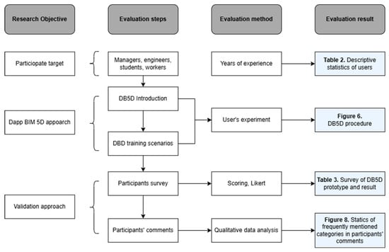 To assess the effectiveness and usability of the proposed DB5D framework, a comprehensive evaluation methodology was designed, consisting of two primary stages: usability testing and effectiveness assessment, as illustrated in Figure 6. This dual-stage approach ensures both technical functionality and practical applicability are thoroughly evaluated through a mixed-methods approach combining quantitative metrics via Likert-scale surveys and qualitative feedback through structured user comments, aligning with established practices for evaluating construction technology prototypes.