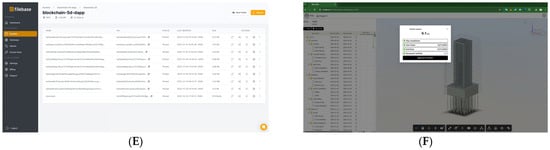 Figure 7. (A) Project manager creates a project and a fund; (B) The participant visualizes construction progress; (C) Extract quantities from the BIM model; (D) The Project manager submits payment to the client; (E) The Document is uploaded to IPFS; and (F) The Client reviews the payment data before approving to transfer the token. - The participant selects projects and construction schedules in those projects (in Figure 7B,C). Then, the participant visualizes construction progress via a Gantt chart and a BIM model in a web browser, which helps connect stakeholders. For instance, the participant modifies the task in the Gantt chart, which corresponds with the BIM model via object identifier (OID), and these changes are recorded in the database.