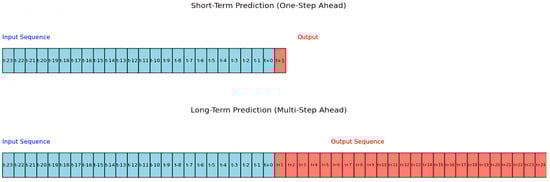 RNNs and their variants like LSTMs are uniquely capable of extracting features from these sequences and handling multivariate inputs, making them suitable for multi-step forecasting. To train the LSTM models, a sliding window approach was used to create these supervised learning sequences. For short-term, one-step-ahead predictions, a historical sequence of inputs (e.g., 24 h) was used to predict the value at the next step. For long-term, multi-step-ahead predictions, a direct multi-horizon approach was used, where the same input structure forecasted a sequence of future values. This data preparation process is visually represented in Figure 5.