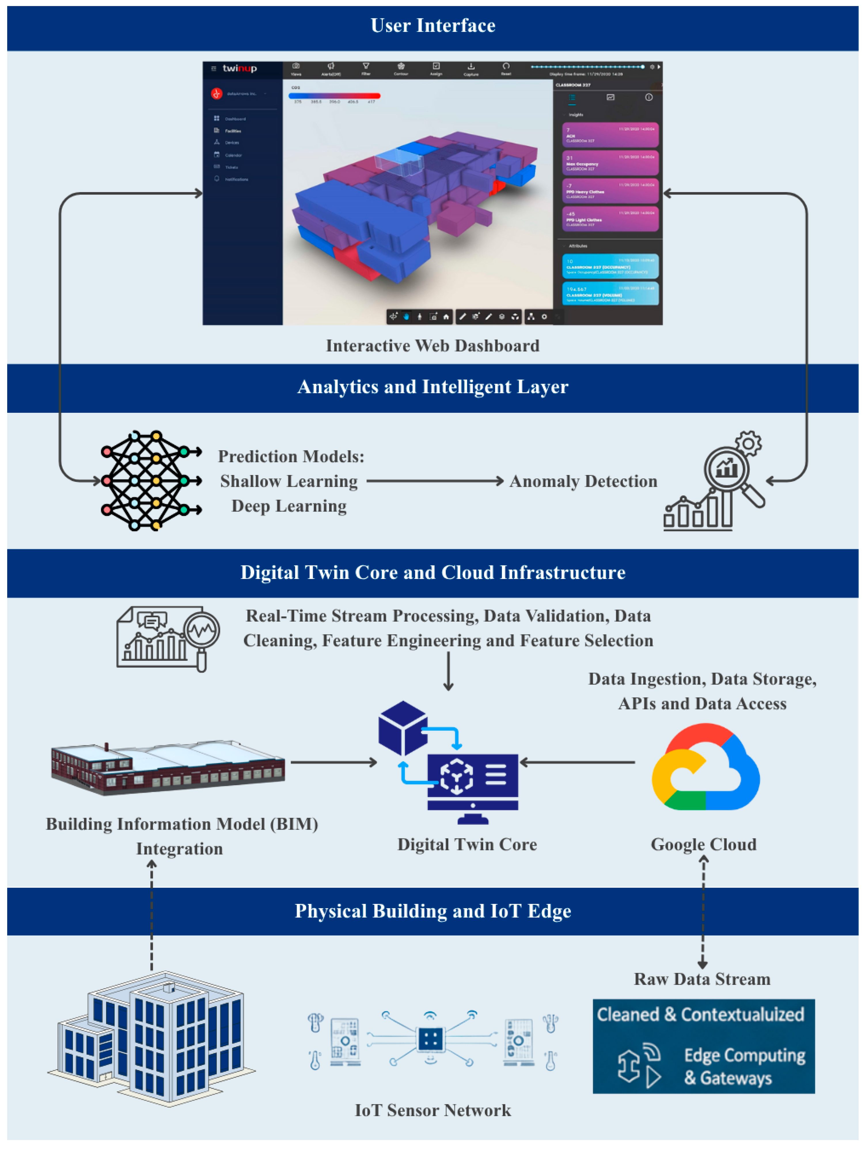 - Iqbal, F.; Mirzabeigi, S. Digital Twin-Enabled Building Information Modeling–Internet of Things (BIM-IoT) Framework for Optimizing Indoor Thermal Comfort Using Machine Learning. Buildings 2025, 15, 1584. [Google Scholar] [CrossRef]