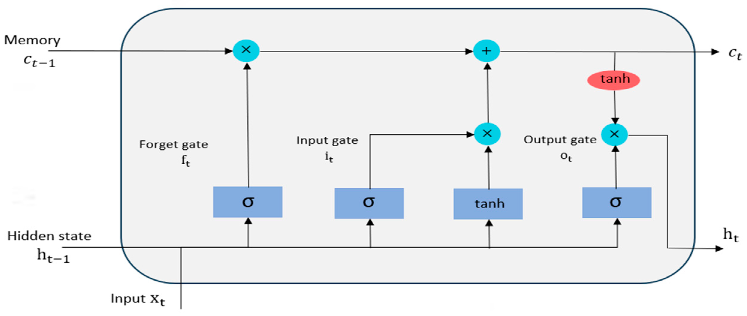 - Cell State Update (): The cell state is updated by a combination of the previous cell state (scaled by the forget gate) and the new candidate values (scaled by the input gate).