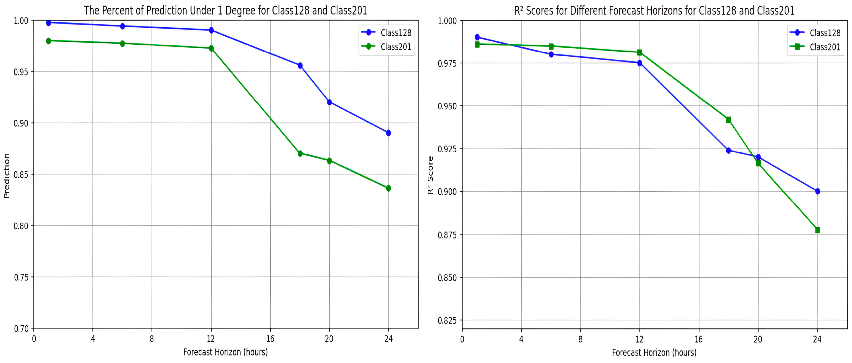 | Model | Class | MAE | RMSE | R2 | Percentage of Prediction Under 1 Degree |