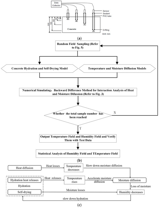 Test apparatus and flow chart. (a) Schematic diagram of the test device [48]. (b) Research method flow chart. (c) Interaction between temperature and relative humidity in early-age concrete.