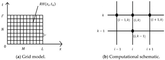During the difference analysis simulation, the analyzed region is discretized into a grid model, and the diffusion equations, such as Equations (9) and (11), are transformed into second-order difference equations. Below is the second-order difference equation corresponding to Equation (11):
