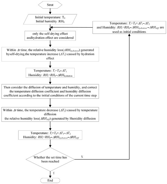 To simulate the spatiotemporal distribution of relative humidity in early-age concrete while considering the temperature–humidity interaction, a semi-decoupled approach was adopted. The process of temperature and relative humidity was divided into multiple time steps. Within each time step, two sub-stages were considered. In the first sub-stage, it is focused on the internal processes within the concrete. The changes in temperature and relative humidity due to hydration and self-drying, excluding diffusion effects, were considered. In the second sub-stage, the influence of environmental diffusion was incorporated to revise the temperature and relative humidity. For simplicity while maintaining accuracy, it was assumed that the diffusion factors for temperature and relative humidity remained constant within each time step, provided the step size was sufficiently small. At the end of each step, the diffusion factors were updated based on the current temperature and relative humidity values, ensuring an accurate representation of their dynamic interaction in early-age concrete.