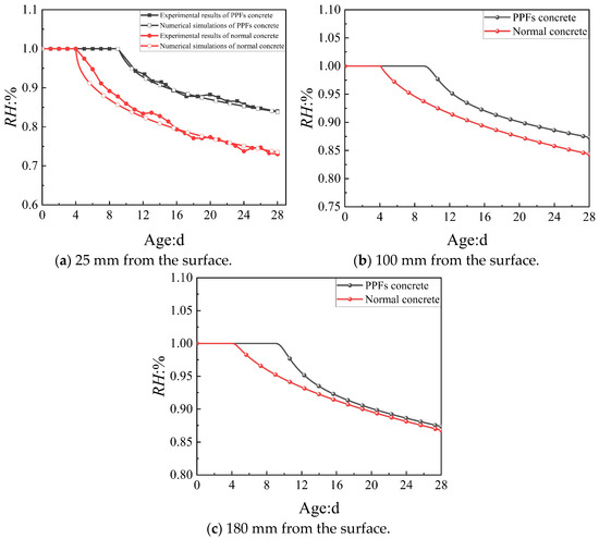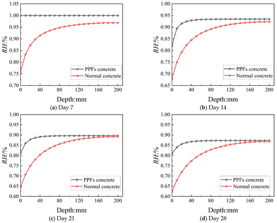 Further, Figure 7 shows the simulated temporal evolution RH at different depths. By Day 28, RH at a depth of 250 mm decreased by 28% in normal concrete, whereas it only decreased by 16% in PPF-modified concrete. At 100 mm, the decreases were 16% and 13% for normal and PPF-modified concrete, respectively. However, at 180 mm, the water retention effects of both mixtures decreased by 12%, indicating that the water retention effect of PPFs weakens as the distance from the concrete surface increases.