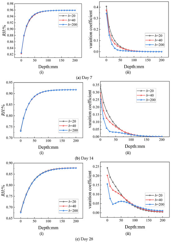 Effects of diffusion factor correlation length on normal concrete’s RH over time. (i) The influence of relevant length b on relative humidity. (ii) The influence of the relevant length b on the variation coefficient.
