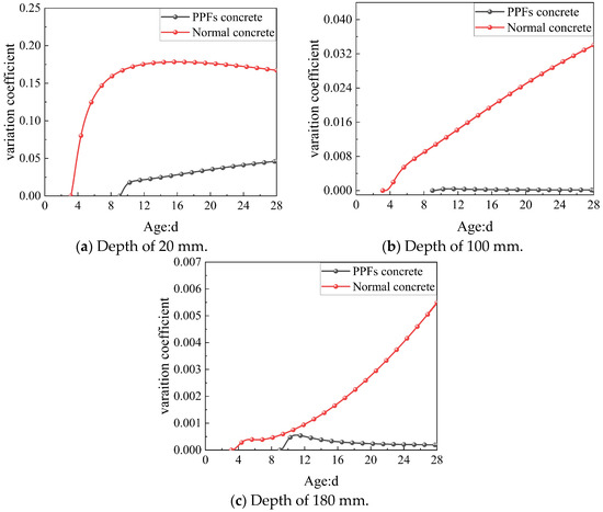 The impact of diffusion factor variations on RH in PPF-modified concrete is illustrated in Figure 10. In this simulation, the correlation length and variation coefficient of the diffusion factor were set to 20 mm and 0.5, respectively, while other parameters followed Table 1 and Table 2. A comparison with normal concrete indicates that the RH variation in PPF-modified concrete, caused by the spatial variations in the diffusion factor, was much lower. Specifically, at a depth of 20 mm, the RH variation coefficient was 0.02 for PPF-modified concrete, compared to 0.18 for normal concrete. As depth increased, such as at 100 mm and 180 mm, the variation coefficient in PPF-modified concrete decreased rapidly to zero. These results suggested that the RH distribution in PPF-modified concrete is less sensitive to the spatial variability of the diffusion factor than in normal concrete. The RH field in PPF-modified concrete was nearly uniform, except near the surface, thereby reducing the risk of shrinkage and early-age cracking.