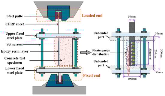 Figure 1 illustrates the customized test apparatus and instrumentation layout used to evaluate the bond performance at the CFRP–concrete interface. The concrete prism specimen was laterally confined by a steel frame and axially anchored to a rigid steel base using high-strength bolts at both the loaded and fixed ends, effectively restraining rotational and translational movement during loading. To prevent premature failure at the gripping zone, a 50 × 50 mm Q235 steel plate was bonded to the CFRP sheet at the loaded end using high-strength epoxy resin for local reinforcement. A universal testing machine applied a monotonic tensile load to the CFRP sheet at a constant displacement rate of 1 mm/min. As shown in the right view of Figure 1, seven strain gauges labeled S1 through S7 were uniformly installed along the bonded length of the CFRP sheet to measure the strain distribution along the FRP–concrete interface. The data were collected in real time using a static strain acquisition system.