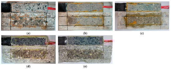 FRP-concrete interface damage under freeze–thaw cycles: (a) FT0; (b) FT50; (c) FT100; (d) FT150; (e) FT200.