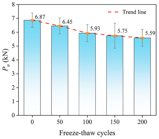 As illustrated in Figure 3, the ultimate bond strength decreased progressively with the number of FT cycles. Compared with the uncycled control group, reductions of 6.0%, 13.6%, 16.3%, and 18.5% were recorded after 50, 100, 150, and 200 cycles, respectively. The degradation rate was more pronounced within the first 100 cycles and became less significant thereafter, indicating that most interfacial deterioration occurred during the early stage of FT exposure, whereas subsequent cycles primarily propagated existing defects and caused a gradual reduction in the residual bond capacity.