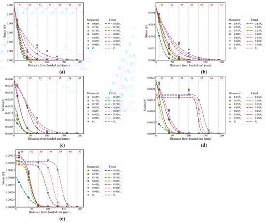 This study conducted single-lap shear tests on FRP-concrete specimens and collected strain distribution data by attaching strain gauges to the specimen surfaces. During the initial loading phase, the strain values recorded by different gauges showed minimal variation, making it difficult to capture the strain distribution accurately. To address this, the analysis focused only on strain data corresponding to 65–100% of the ultimate load. Additionally, due to the gauge length limitations of the strain gauges and the inherent randomness associated with internal cracking and heterogeneous material composition in concrete, the CFRP strain data were fitted using Equation (1), which is based on the strain distribution model proposed by Dai et al. []. This approach helps to eliminate local fluctuations and provides a more accurate representation of the interfacial strain distribution at various load levels.