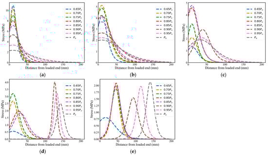 FRP stress distribution: (a) FT0; (b) FT50; (c) FT100; (d) FT150; (e) FT200.