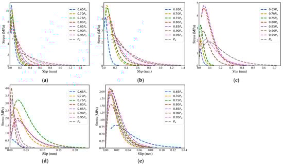Bond-slip curves for different loads: (a) FT0; (b) FT50; (c) FT100; (d) FT150; (e) FT200.